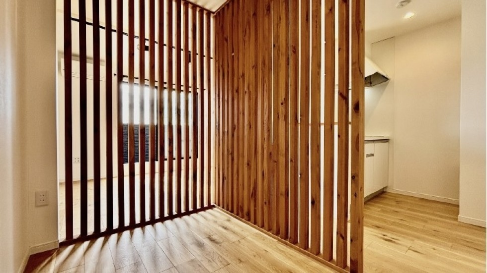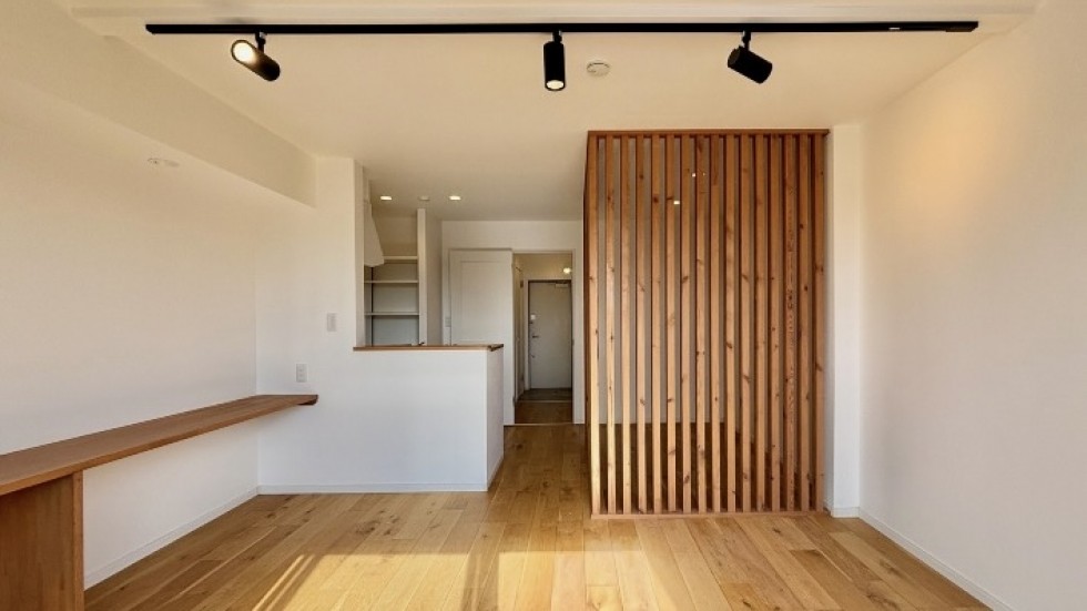 この部屋は2019年築のデザイナーズアパート。ルーバーの間仕切りや無垢のフローリング、インテリアを選ばない白の壁が心地よい空間を作っています。もっと居心地よくお家時間を過ごせるように部屋の片隅やベランダに適したコンパクトなグリーンを置きたい。