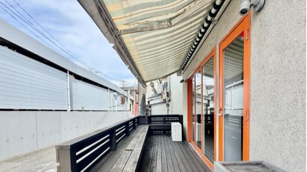 ※サービスカウンター、作り付けのベンチ、ガス栓、排水、エアコン、トイレ、手洗い場、換気扇、そしてテラス席として使える外デッキは残置物