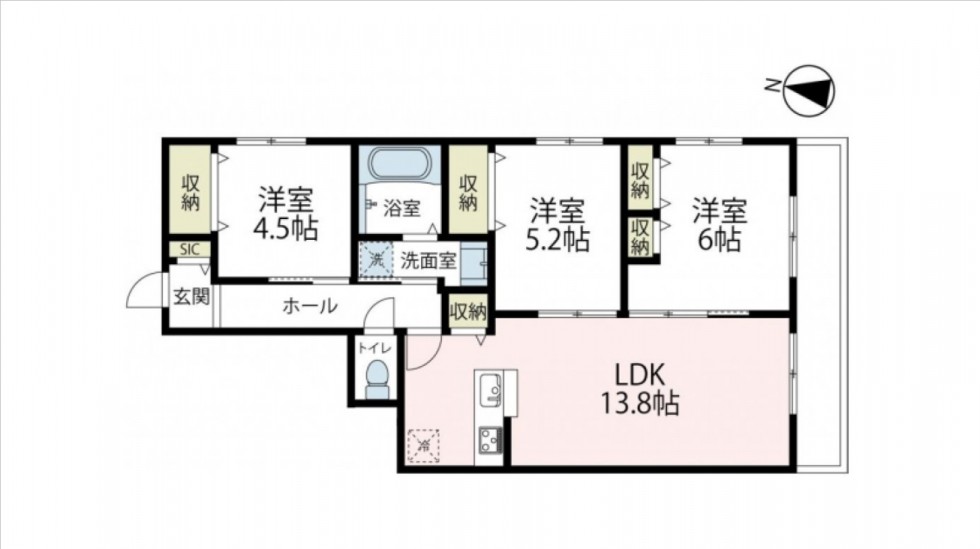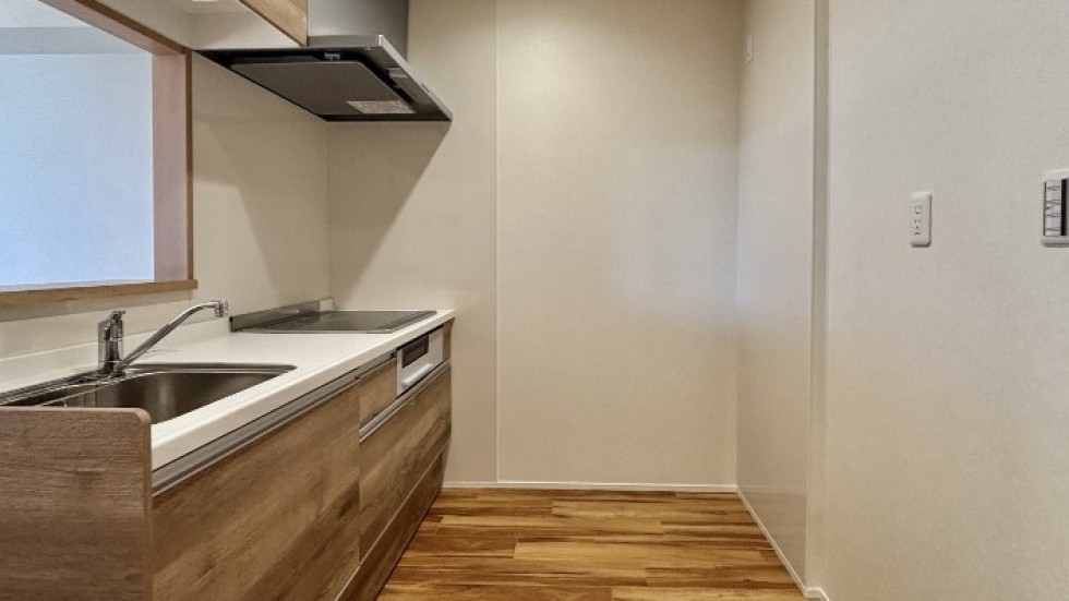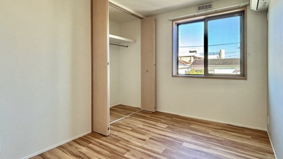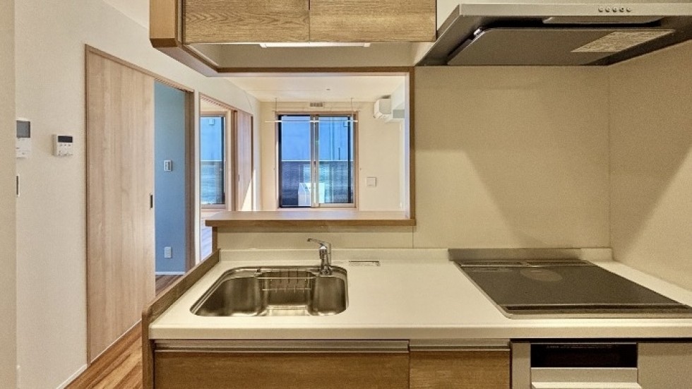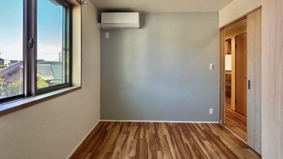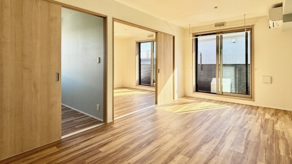 この部屋は2025年11月築の新築アパート。リビングと各部屋から山のグリーンがよく見えて、自宅時間が居心地いいです。3LDKなので、夫婦2人暮らしなら、1つは寝室にして、あと2つは、1人ずつ仕事部屋を持てるのがいいところ。長谷に住むと両親や友人が遊びに来るようになるかもしれない。リビングのキッチン側にちょっと大きめのダイニングテーブルを置いて、バルコニー側にはソファとTVを置いても十分暮らせる空間。