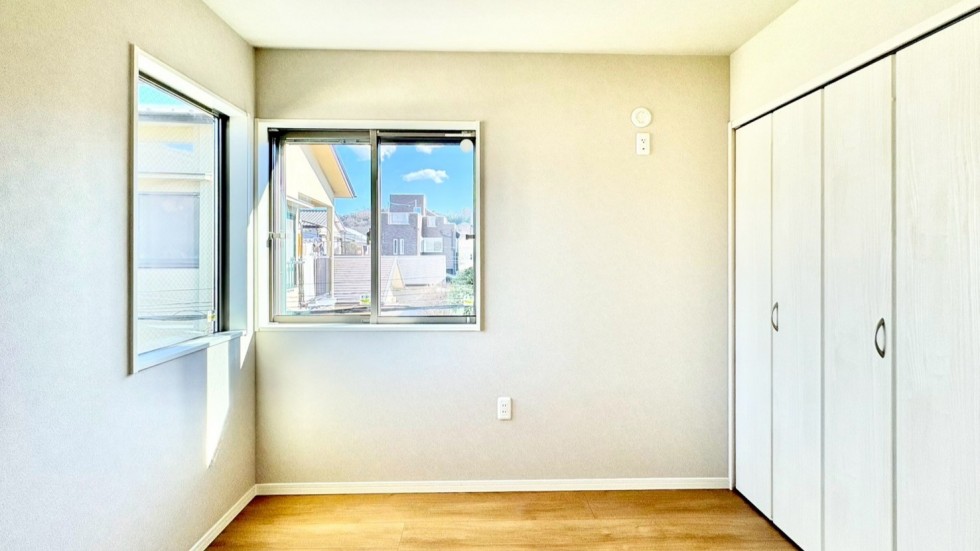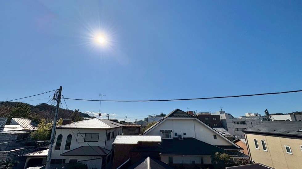 南東角部屋の特権として、朝の光がすっと届くベッドルーム。鎌倉駅から徒歩9分という立地でありながら、リビングの先に広がる景色に、視界を遮るものがないのは最高。