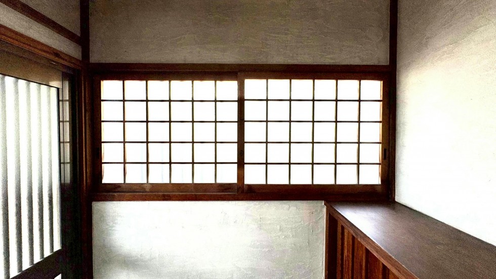 そして2階。ミントグリーンの壁と、まん丸の窓。この丸窓、開けると階段が覗ける仕掛けになっている。遊び心があって、かわいい。障子を開けると広縁があり、空がどんと広がる。逗子の空気が、気持ちよく流れてくる。