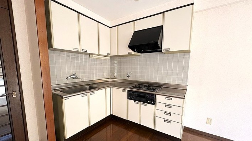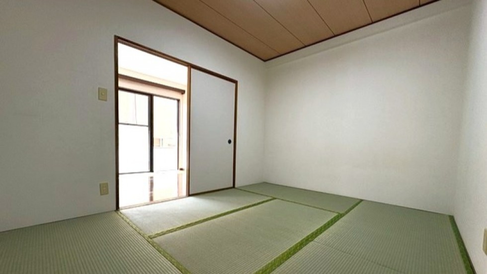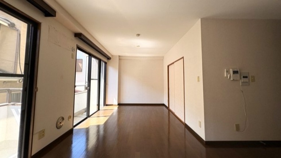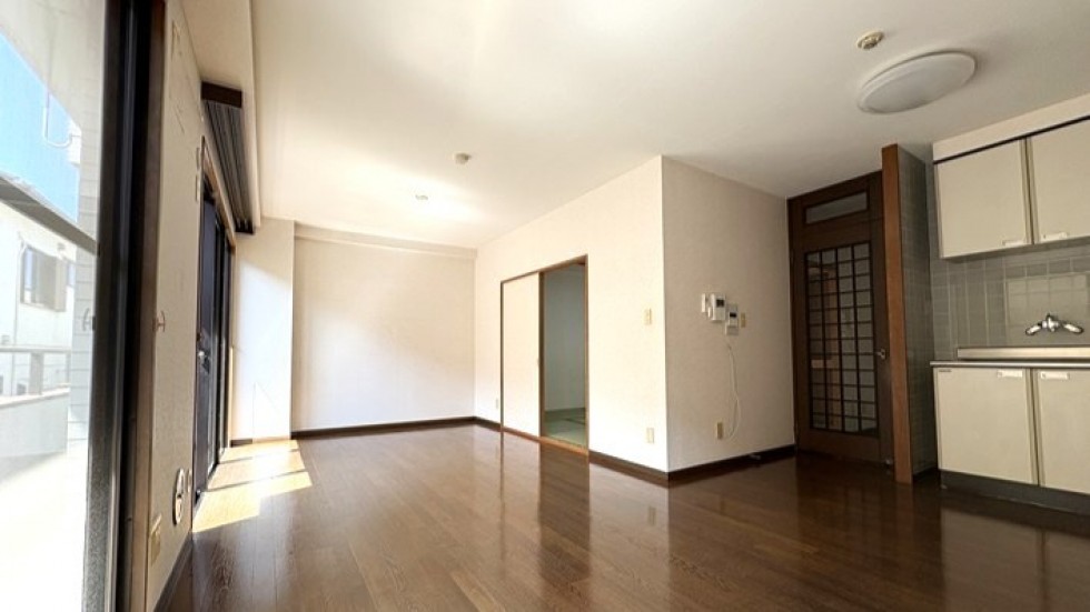 室内に入ると、広さに驚きます。最近の新築マンションにはなかなかないタイプの2LDKで、L字型の広いキッチンがあって、和室もある。畳は張り替えたばかりで、青々としています。リビングのフローリングもきれいに手入れされていて、築年数を感じさせません。