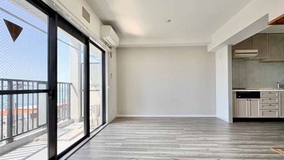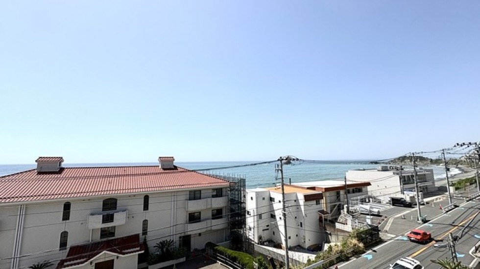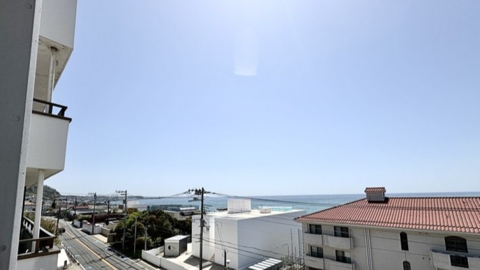 物件は南東の角部屋。バルコニーからは長者ヶ崎方面・立石公園方面、どちらを向いても海が見渡せます。北側にも小さなバルコニーがあって、そちらは緑の景色。二面バルコニーは風の通りも抜群です。